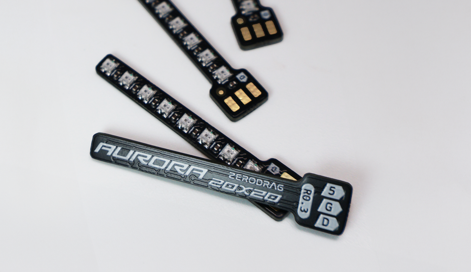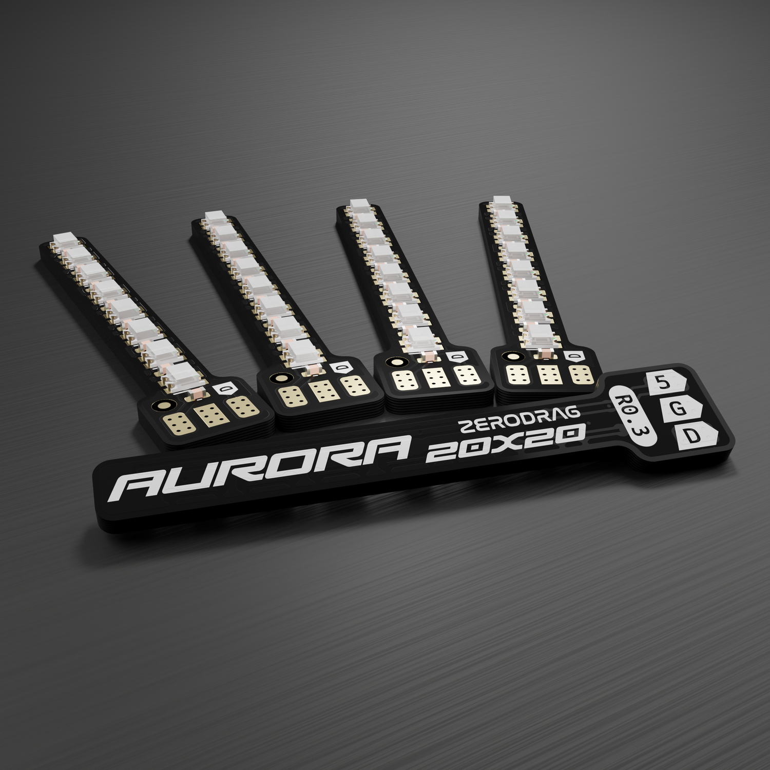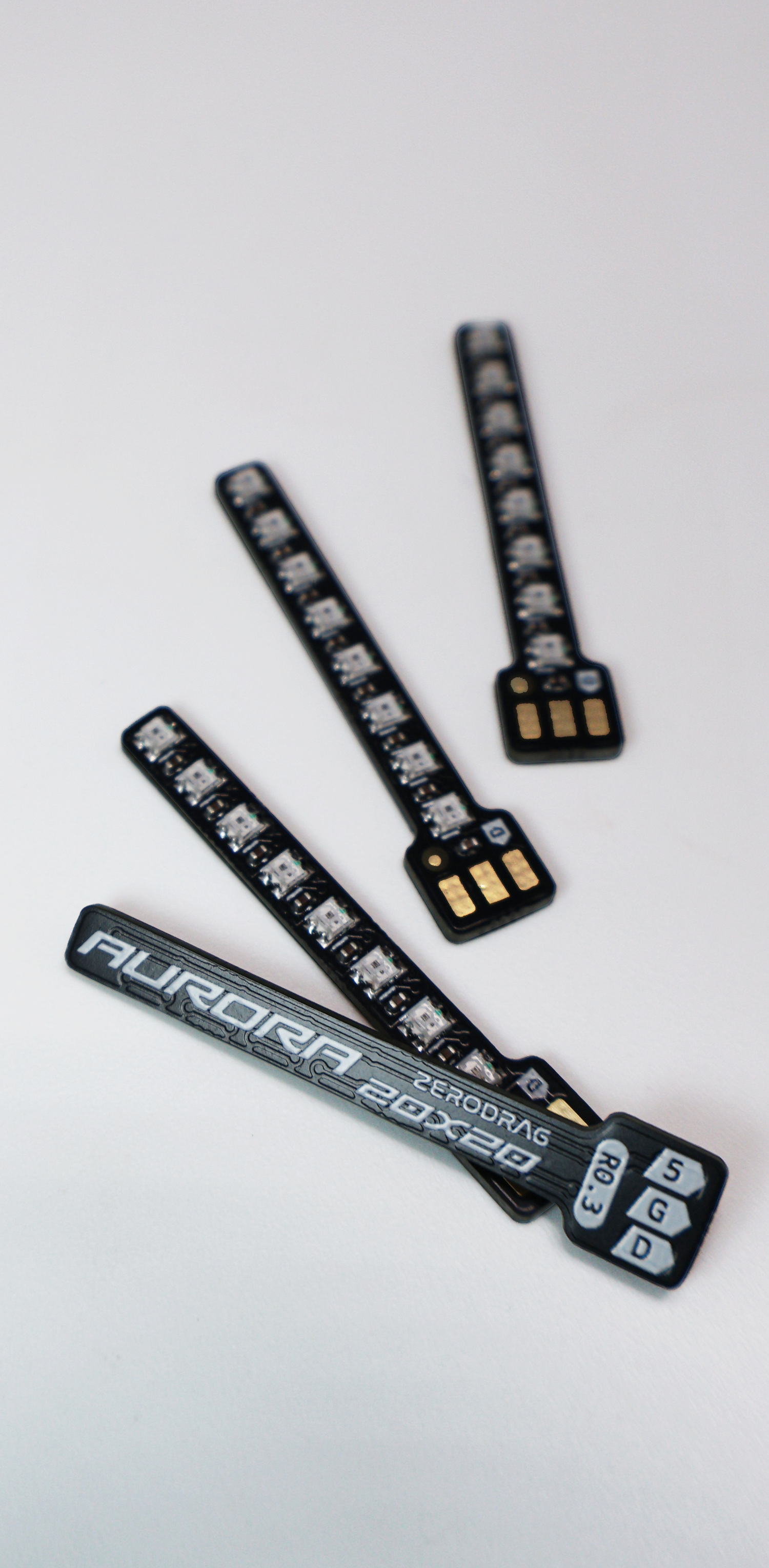 Introducing the Zerodrag Aurora 20x20 LED, a compact, high-performance LED strip tailored for FPV whoops and racing drones. Featuring 8 individual 2x2mm LEDs aligned in a sleek single row, this module ensures bright, vibrant lighting for improved visibility and aesthetics during flight.Designed with racing enthusiasts in mind, the Zerodrag Aurora ensures that your drone remains lightweight while enhancing its visibility, whether flying at high speeds or performing technical maneuvers. Built for ease of integration.